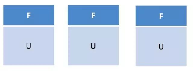 译者注: 下图中代表一个具有3个failgroup的Normal冗余的磁盘组。其中每个failgroup:F代表free的空间 ,U代表已经使用的空间。