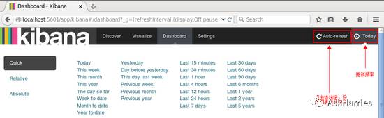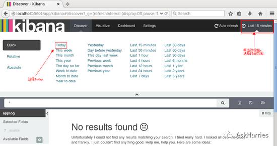 接下来切换到Discover标签上,注意右上角是查询的时间范围,如果没有查找到数据,那么你就可能需要调整这个时间范围了,这里我选择Today: