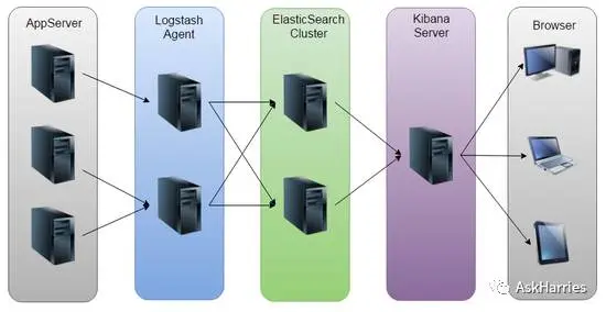 如图:Logstash收集AppServer产生的Log,并存放到ElasticSearch集群中,而Kibana则从ES集群中查询数据生成图表,再返回给Browser。