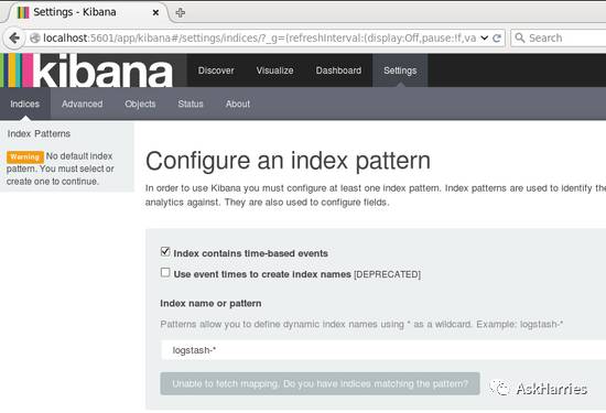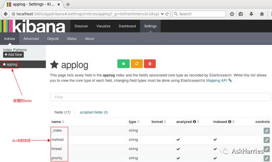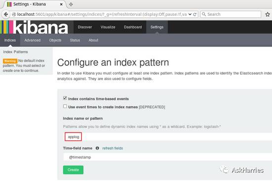 为了后续使用Kibana,需要配置至少一个Index名字或者Pattern,它用于在分析时确定ES中的Index。这里我输入之前配置的Index名字applog,Kibana会自动加载该Index下doc的field,并自动选择合适的field用于图标中的时间字段: