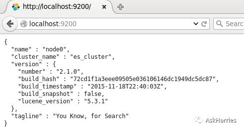 然后可以打开页面localhost:9200,将会看到以下内容: