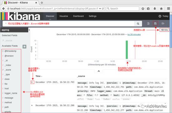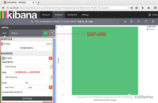 点击右边的保存按钮,保存该查询为search_all_logs。接下来去Visualize页面,点击新建一个柱状图(Vertical Bar Chart),然后选择刚刚保存的查询search_all_logs,之后,Kibana将生成类似于下图的柱状图(只有10条日志,而且是在同一时间段的,比较丑,但足可以说明问题了:) ):