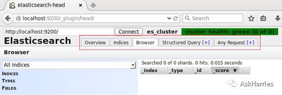 刚刚安装的head插件,它是一个用浏览器跟ES集群交互的插件,可以查看集群状态、集群的doc内容、执行搜索和普通的Rest请求等。现在也可以使用它打开 localhost:9200/_plugin/head 页面来查看ES集群状态: