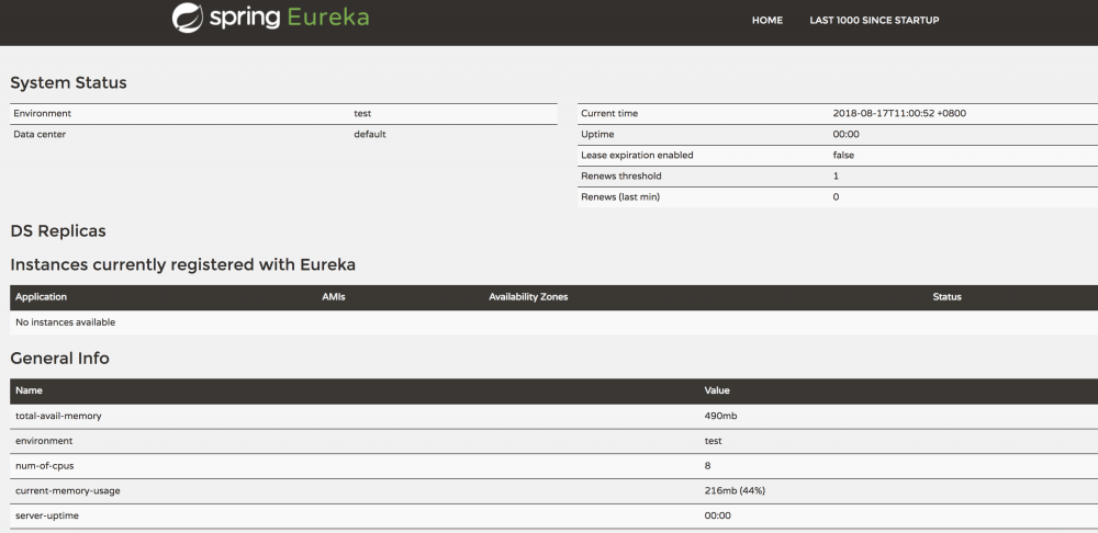 运行EurekaServer,访问 http://localhost:8001,可以看到下面的页面
