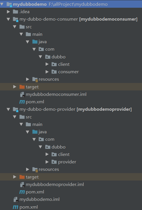 本地项目用的maven项目,一个消费模块一个服务模块,结构如下所示:
