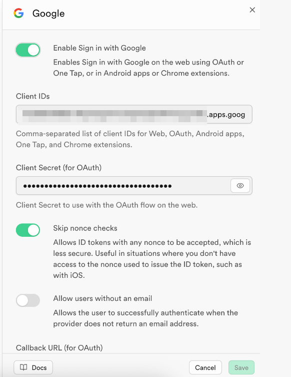 | Client ID | 必填(来自 Google Cloud) |