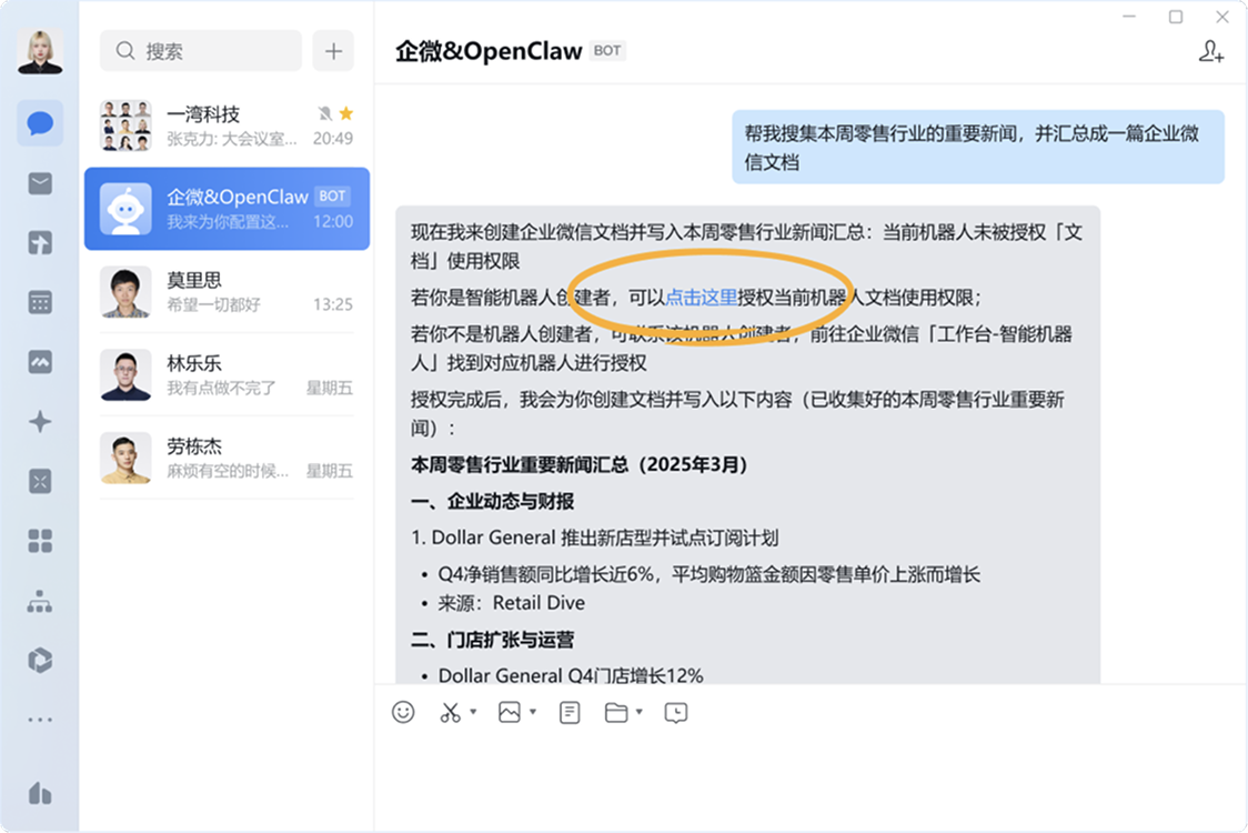 1. 可直接要求机器人操作文档,例如:“帮我搜集本周零售行业重要新闻,汇总成一篇企业微信文档”。机器人会自动发送授权连接,请你授权。