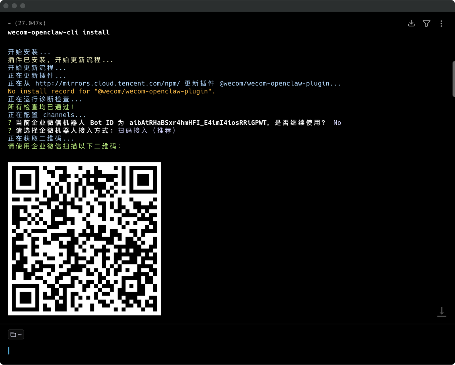前提:请升级为最新的企业微信OpenClaw插件。如果还未升级,可在本地终端中输入以下代码: