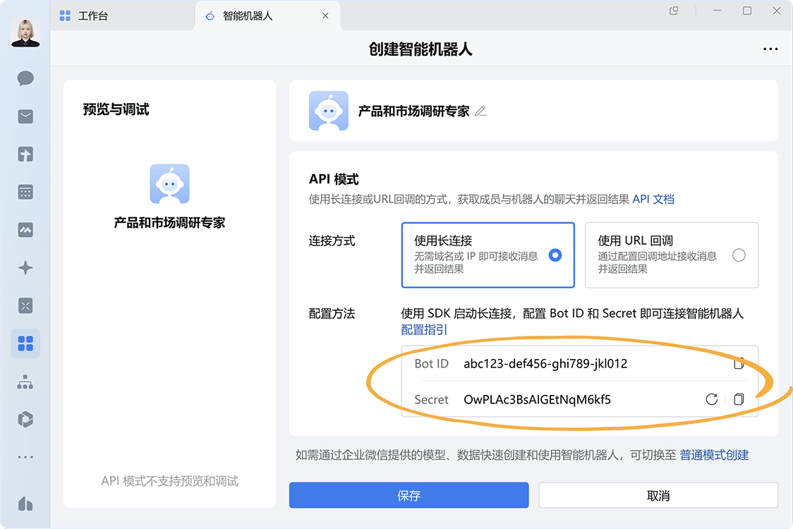 选择以 长连接 方式创建,并获取Bot ID 和 Secret。