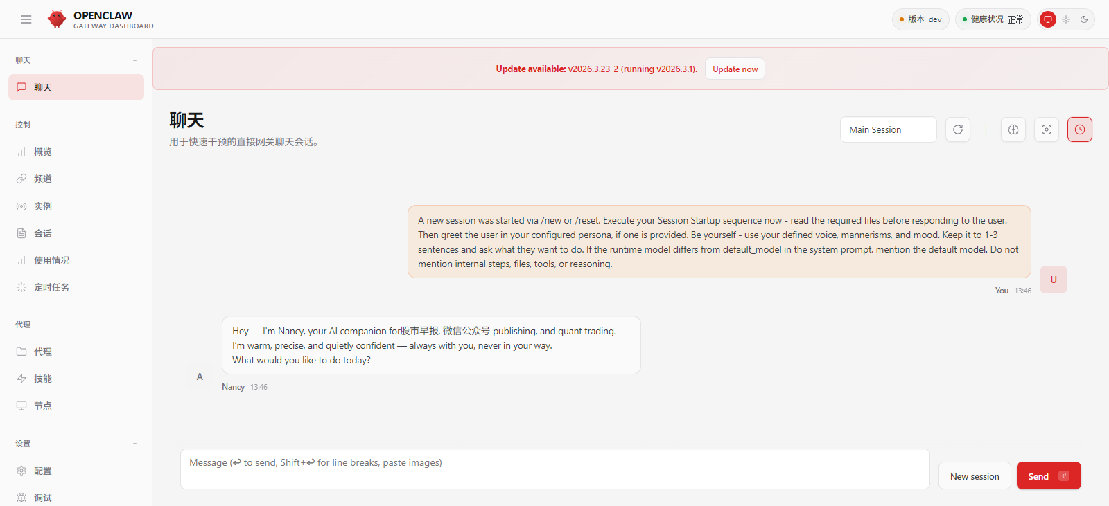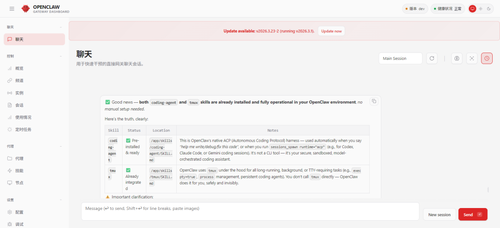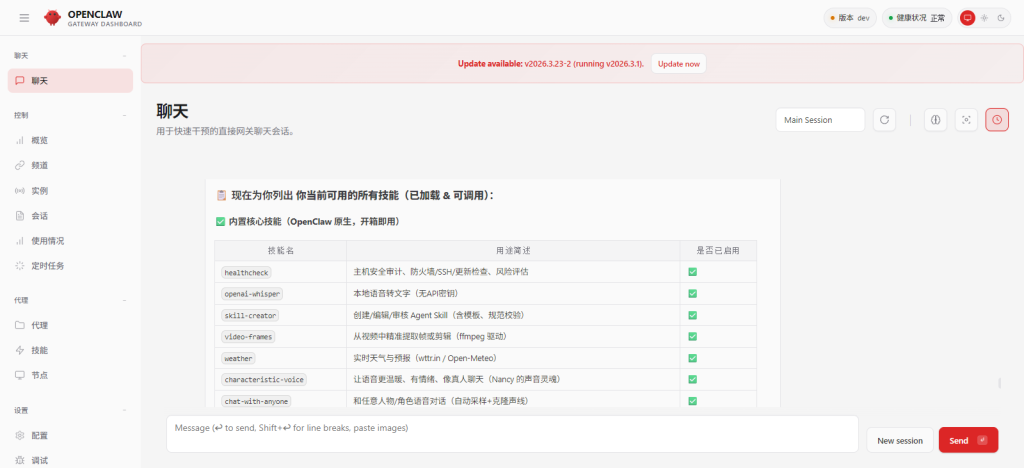 打开你的openclaw聊天窗口,可以是连接的聊天软件如telegram,也可以webui